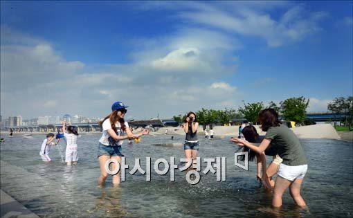 [아시아경제 최우창 기자]장마가 소강상태를 보인 24일 서울 여의도 물빛광장을 찾은 학생들이 파란 하늘 아래 물놀이를 즐기며 즐거운 시간을 보내고 있다.