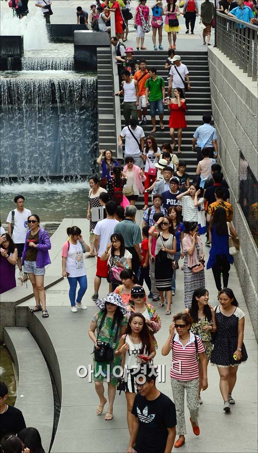 [아시아경제 최우창 기자]장마가 소강상태를 보인 24일 서울 청계광장에서 시민들이 평일임에도 불구하고 화창한 날씨를 만끽하고 있다.