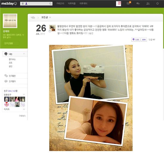 김태희는 26일 자신의 미투데이를 통해 "촬영장에서 우연히 발견한 완이 대본! 궁금해서 집에 오자마자 휴대폰으로 검색해서 '아헤때' 4부까지 봤는데 내가 좋아하는 감성적이고 잔잔한 영화 '러브레터' 느낌이 나더라는...살아있네~ 내동생~! 다음 영화도 파이팅~!!!"이란 글과 함께 이완을 응원하며 사진 두 장을 게재했다.
