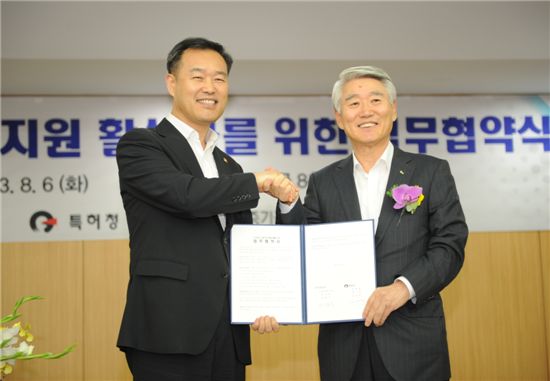 김영민 특허청장과 안택수 신용보증기금 이사장은 6일 오후 서울 마포구 신용보증기금 본사에서 지식재산보증 시행을 위한 ‘지식재산 금융지원 활성화를 위한 업무협약’을 맺었다.
