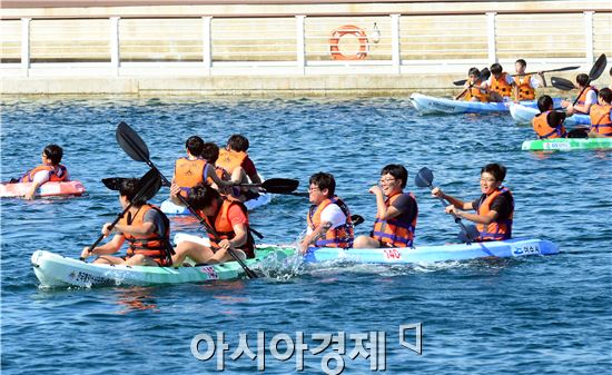 휴가철을 맞아 요즘 여수엑스포해양공원에서 무료로 운영되는 카약 체험교실에 참가한 학생들이 직접 노를 저어 카약을 이동하면서 즐거움을 만끽하고 있다. 사진제공=여수시