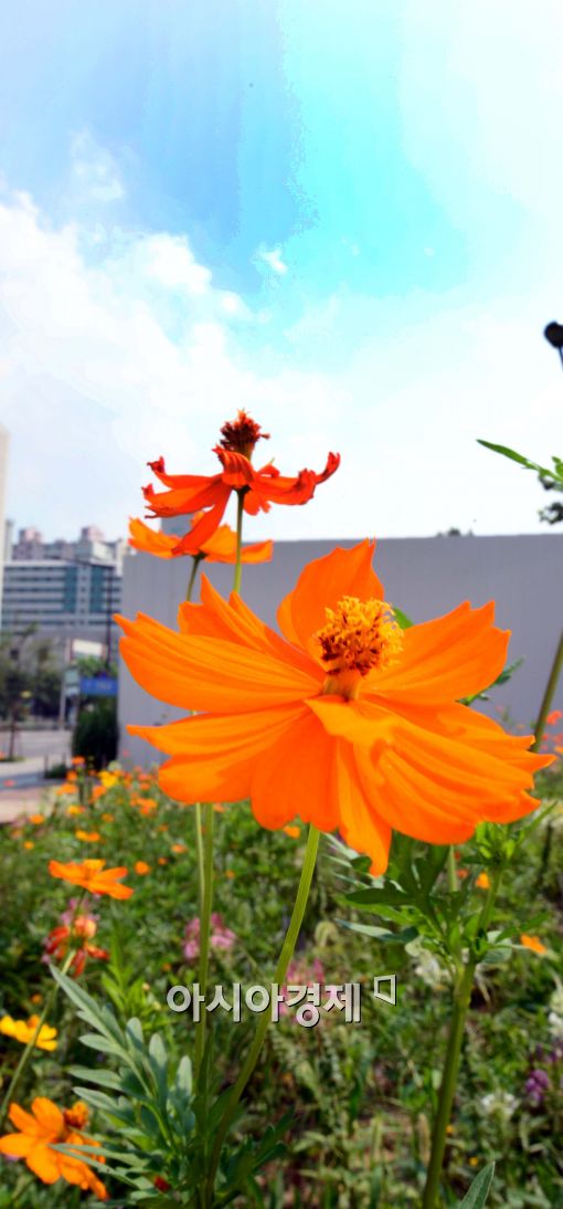 [아시아경제 최우창 기자]입추가 지나고 말복인 12일 폭염의 기세는 수그러들지 않고 있는 가운데 서울숲에서 코스모스가 활짝 펴 있다.