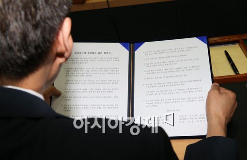 [개성=사진공동취재단] 제7차 개성공단 남북당국실무회담이 14일 개성공단 종합지원센터 회의실에서 열려 극적인 타결을 한 가운데 김기웅 남측 수석대표가 합의.