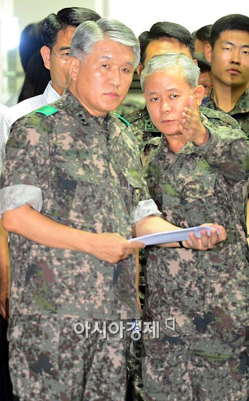 [아시아경제 최우창 기자]고성균 육사 교장이 26일 서울 용산구 국방부에서'육사 제도문화 혁신'에 대한 브리핑을 하기 전 국방부 관계자들과 대화를 나누고 있다.