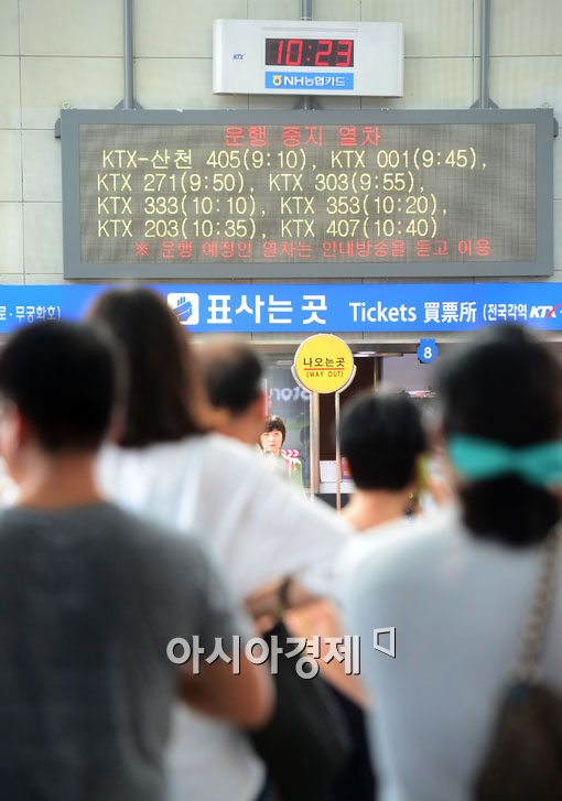 [아시아경제 백소아 기자] 대구역에서 서울로 향하던 무궁화호 1204호 열차와 KTX 4012호 열차가 추돌한 31일 서울 중구 서울역에서 지연되는 열차들로 시민들이 길게 줄을 서 있다.