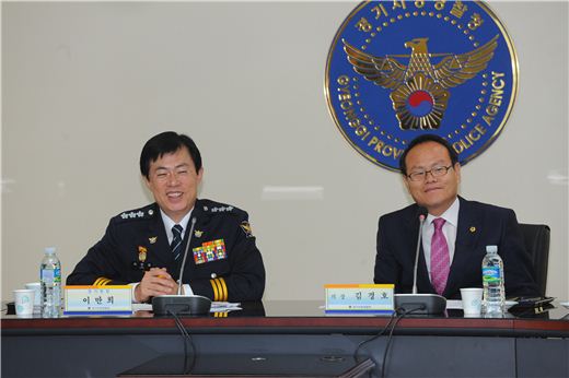 [수원=이영규 기자]경기지방경찰청이 11일 수원 장안구 창룡대로 본청 제1회의실에서 경기도의회 김경호 의장과 임채호ㆍ장호철 부의장, 10개 상임위원회 위원장 등 도의원 16명 및 경기경찰청 지휘부가 참석한 가운데 '치안설명회'를 가졌다.
