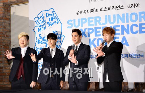[아시아경제 송재원 기자] 그룹 슈퍼주니어가 11일 오후 서울 영등포 타임스퀘어에서 열린 ‘슈퍼주니어's 익스피리언스 코리아’ 출간 기념 기자간담회에 참석해 포토타임을 갖고 있다.