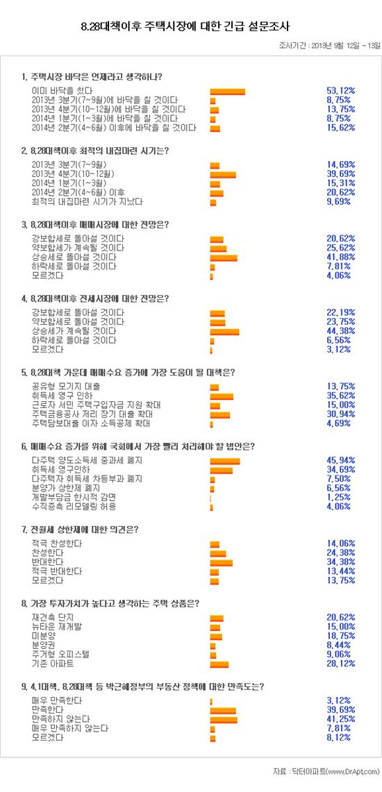 닥터아파트는 12∼13일 이틀간 회원 526명을 대상으로 '8·28전월세 대책' 발표 이후 주택시장에 대한 긴급 설문을 한 결과, 전체의 53.1%가 "주택시장이 이미 바닥을 쳤다"고 응답했다.