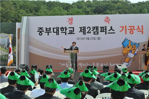 중부대는 이날 덕양구 대자동 산 15-1번지 26만4000㎡ 부지에 지하 2층, 지상 9층 규모의 연구강의동 2개동과 광장, 체육시설, 공원 및 녹지시설을 갖춘 최첨단 그린캠퍼스를 조성키로 하고 첫 삽을 떴다. 이 곳에는 총 22개 학과 입학정원 865명이 공부하게 된다. 2015년 개교한다.