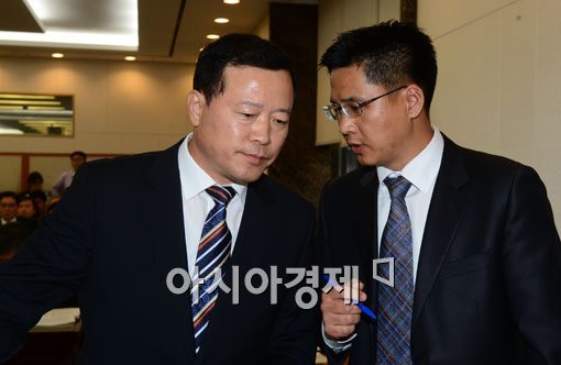 [아시아경제 백소아 기자] 14일 서울 종로구 세종로 정부서울청사에서 열린 국회 안전행정위원회 안전행정부 국정감사에서 박경국 국가기록원장(왼쪽)이 의원들의.