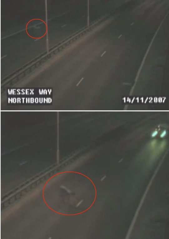 이 영상에는 정체불명의 괴생명체가 심야의 고속도로를 네발로 가로지르는 모습이 담겨 있다. 이 괴생명체는 네발로 움직이지만 사람의 모습에 가깝다. 시속 100km가 넘는 속도로 달리는 자동차 사이를 곡예 하듯 빠져 나가는 모습도 놀랍다.