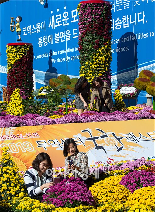 [아시아경제 윤동주 기자] 16일 서울 강남구 삼성동 코엑스에서 열린 '무역센터 국화 페스티벌'을 찾은 시민들이 활짝 핀 50만 송이의 국화로 꾸민 작품 속에서 .