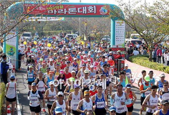 [아시아경제 노해섭 기자]제10회 해남땅끝마라톤대회가 20일 전남 해남 우수영 국민관광지 운동장에서 열렸다. 해남신문이 주최한 이날 대회에서 전국1500여명의 마라토너들이 출발 신호와 함께 힘차게 달리고 있다.