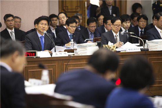 [수원=이영규 기자]24일 경기도청에서 열린 국회 안전행정위원회의 경기도에 대한 국정감사에서는 김문수 경기도지사의 지난해 새누리당 대선 경선후보 참여와 이에 따른 도정공백이 현재의 재정난 원인을 가중시켰다는 주장을 두고 설전이 이어졌다.