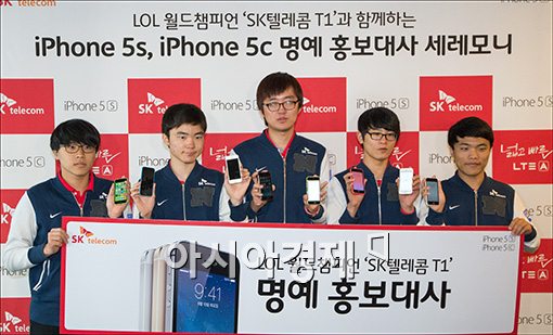 [아시아경제 윤동주 기자] 애플의 아이폰5s-5c 국내 판매가 시작된 25일 서울 SKT 종로점에서 롤드컵 우승팀인 SKT 게임단 T1 선수들이 아이폰 명예 홍보대사로 .