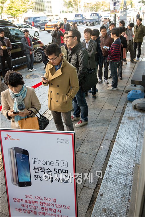 [아시아경제 윤동주 기자] 애플의 아이폰5s-5c 국내 판매가 시작된 25일 서울 SKT 종로점에서 아이폰을 구입하기 위해 대기자들이 줄을 서고 있다.