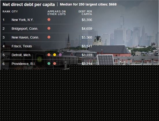 디트로이트의 직접부채 기준 주민 1인당 순부채 규모는 3223달러로 250개 도시 중 다섯 번째로 많았다. 가장 부채가 많은 도시는 뉴욕이었다. 뉴욕 시민은 1인당 5356달러의 빚을 지고 있는 것으로 집계됐다. 코네티컷주의 브리지포트(4659달러)와 뉴 헤븐(3560달러), 텍사스주의 프리스코(3541달러)도 디트로이트보다 1인당 시민 부채 규모가 더 많았다.