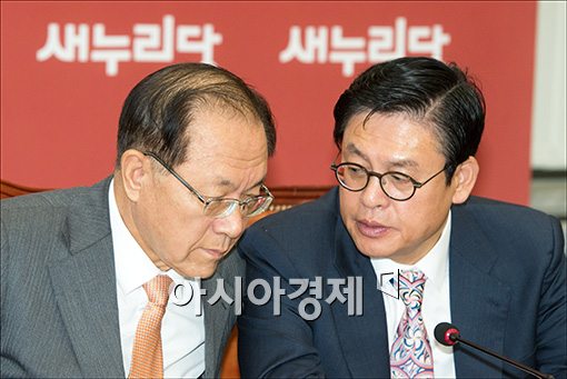 [아시아경제 윤동주 기자] 황우여 새누리당 대표(왼쪽)가 4일 서울 여의도 국회에서 열린 최고위원회의에서 정우택 의원과 의견을 나누고 있다.