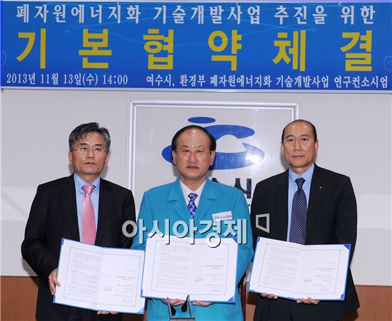 김충석 여수시장(가운데)은 13일 오후 여수시청 상황실에서 삼호환경기술㈜ 이장근 대표(오른쪽), ㈜가온씨엔이 박래 대표(왼쪽)와 ‘폐자원에너지화 기술개발사업’ 추진을 위한 기본협약을 체결했다.