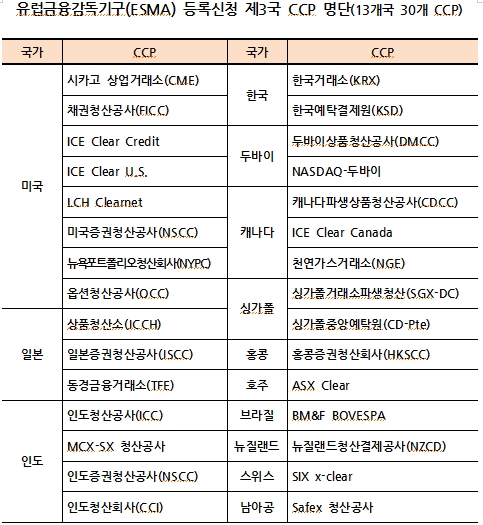 유럽위원회(EC)는 유럽시장인프라규정(EMIR) 제정을 통해 유럽계 금융기관에 청산서비스를 제공하는 모든 CCP에 등록 의무 부과하고 있다. 장내 증권 및 장내외 파생상품 청산을 담당하고 있는 한국거래소가 등록되지 않을 경우 지점 형태의 유럽 금용기관은 한국 내 청산이 불가능해진다. 현재 장내에서는 현재 모건스탠리, 크레디트스위스, 바클레이즈가 해당되며 장외파생상품 청산 참가 예정인 유럽계 은행 11~12곳도 이에 해당된다.