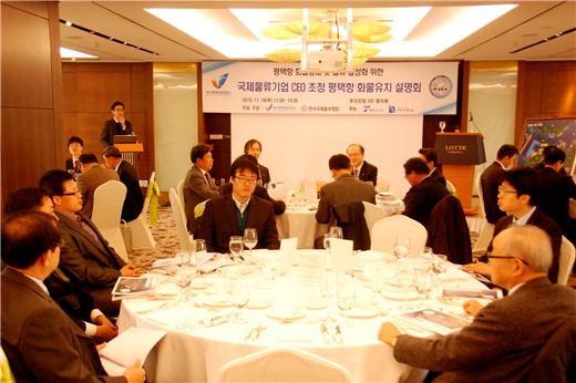 [평택=이영규 기자]경기평택항만공사가 한국국제물류협회와 공동으로 14일 서울 소공동 롯데호텔에서 국제물류기업 CEO(최고경영자)를 초청해 평택항 화물유치 설명회(사진)를 개최했다.