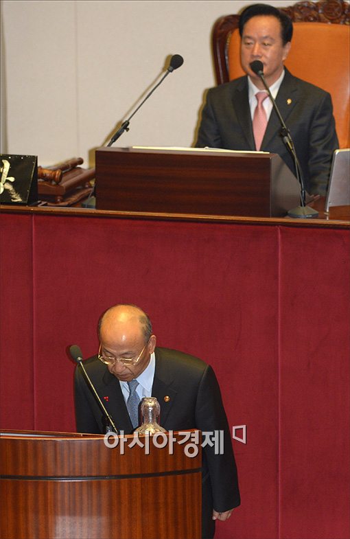 [아시아경제 윤동주 기자] 5일 서울 여의도 국회에서 열린 본회의에서 전병헌 민주당 원내대표와 최경환 새누리당 원내대표가 의견을 나누고 있다.