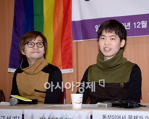 [아시아경제 정준영 기자] 김조광수 감독, 김승환 레인보우팩토리 대표가 10일 오전 서울 종로구 통인동 참여연대 느티나무홀에서 열린 '성소수자 가족구성권 보장 및 혼인신고 수리 촉구를 위한 기자회견'에 참석해 질문을 듣고 있다.