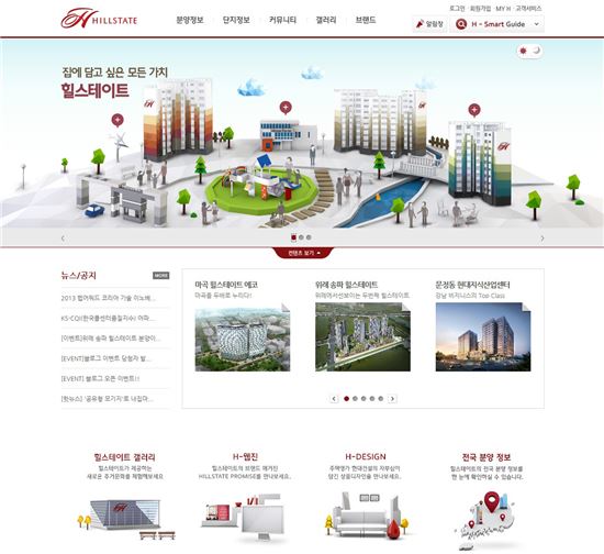 올해 브랜드 론칭 7주년을 맞이해 리뉴얼된 힐스테이트 홈페이지는 구조화된 디자인과 편리한 접근 기능으로 사이트 방문 고객들의 활동성 및 편의성을 크게 향상시켰다는 평가를 받았다.