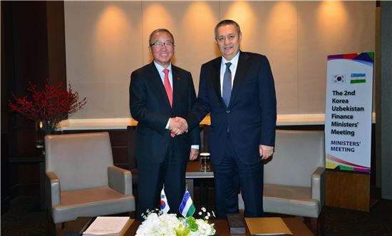▲현오석 부총리가 18일 서울 신라호텔에서 열린 제2차 한·우즈베키스탄 재무장관회의에서 루스탐 아지모프(Rustam Azimov) 우즈베키스탄 부총리와 악수를 하고 있다.