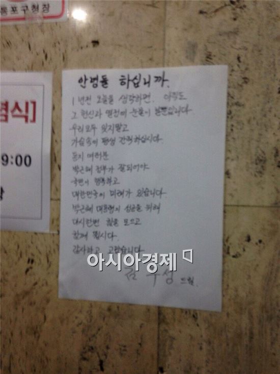 [아시아경제 전슬기 기자, 김인원 기자]김무성 새누리당 의원이 19일 당사에 '안녕들 하십니까' 제목의 소자보를 붙였다. 대학가에 돌고 있는 '안녕하십니까' 대자보와 제목은 비슷했지만 내용은 사뭇 달랐다. 김 의원의 소자보는 대선 1주년을 맞아 캠프 인사들에게 안부를 전하는 내용이 담겼다.