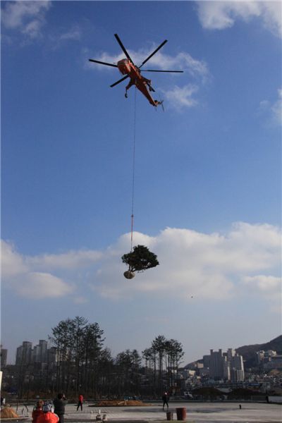 [아시아경제 왕성상 기자] 100년 된 부부소나무가 초대형 산림헬기에 매달려 부산시민공원으로 옮겨져 눈길을 끈다.