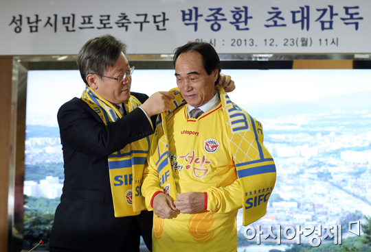[성남=아시아경제 정재훈 기자] 박종환 성남시민프로축구단 초대감독이 23일 오전 성남시청에서 임명장 수여식을 가졌다.