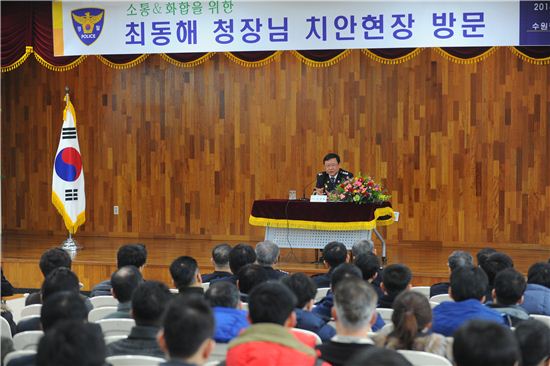 최 청장은 이날 수원중부서 간담회를 마치고 동부파출소를 방문, 파출소장과 직원들을 격려하고 관내 여성안심 귀가길시스템을 점검했다.