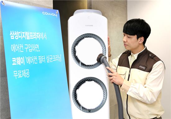 코웨이는 오는 3월 말까지 진행되는 '삼성전자 스마트에어컨 Q9000' 예약판매 기간 중 디지털 프라자에서 에어컨을 구매한 고객에게 코웨이의 에어컨 필터 살균 크리닝을 제공한다.