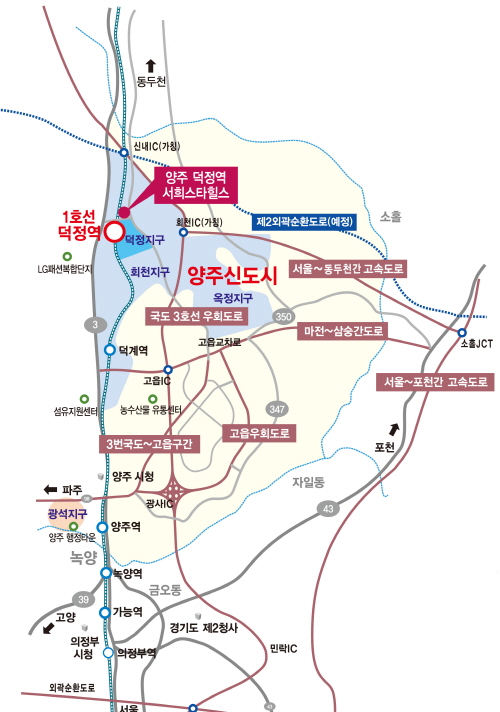 양주지역의 주요 개발호재는 단연 광역 교통망 구축사업이다. 특히 2006년 개통한 경원선 복선전철(의정부∼양주∼동두천) 개통은 잠들어 있던 이 지역 주택시장을 깨우는 계기가 됐다. 서울 도심까지는 1시간, 도봉구까지는 20분대면 갈 수 있는 서울 생활권으로 편입된 것이다.