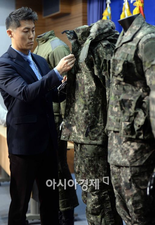[아시아경제 최우창 기자]14일 용산 국방부 브리핑룸에서 방한복, 방탄복, 전투조끼, 방탄헬멧 등 개선된 개인 장구류를 선보이고 있다.