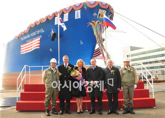 ▲리투아니아의 달리아 그리바우스카이테 대통령이 명명식의 대모(代母)로 나서 선박에 ‘인디펜던스(Independence)호’라는 이름을 부여하는 세리머니를 하고 있다. (리투아니아 달리아 그리바우스카이테 대통령/사진 앞줄 좌측서 두 번째, 현대중공업 이재성 회장/사진 우측서 첫 번째, ‘회그LNG’사 레이프 회그 부회장/사진 우측서 네 번째)
