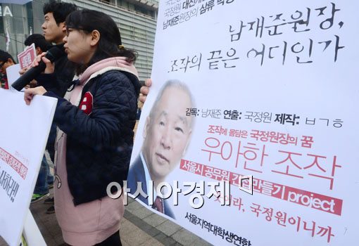 [아시아경제 백소아 기자] 13일 서울 청계광장에서 열린 '간첩조작 국정원 규탄! 남재준 국정원장 해임 촉구! 3.15 부정선거 54주년 맞이 대학생 퍼포먼스 기자회견'에서 참가자들이 남재준 국정원장의 해임을 촉구하는 손팻말을 들고 있다.