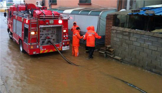 [연합뉴스]29일 많은 비가 내리면서 도로가 침수된 강원 삼척시 삼척해수욕장 인근에서 소방대원들이 배수작업을 지원하고 있다.