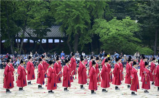 [연합뉴스] 세계무형문화유산으로 등재된 종묘대제(宗廟大祭)가 4일 서울 종묘 정전에서 봉행된 가운데 종묘제례악 보탱평지무가 재현되고 있다.조선의 역대 왕과 왕비의 제사를 지내는 왕실 의례를 종묘제례(宗廟祭禮)라고 하는데, 조선왕조가 지내는 제사 가운데 가장 규모가 크고 중요한 제사였기 때문에 '종묘대제'라고도 불린다.