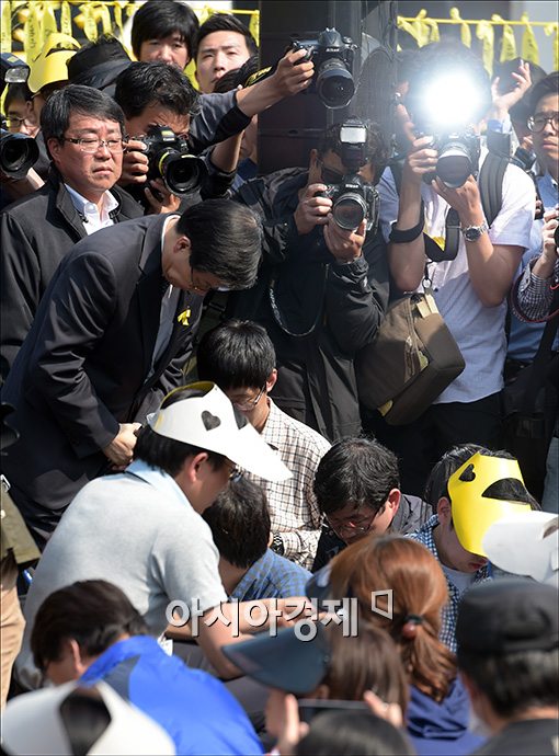 [아시아경제 윤동주 기자] 길환영 KBS 사장이 9일 청와대 앞에서 김시곤 KBS 보도국장 막말 파문과 관련해 세월호 침몰 희생자 유가족 앞에서 고개 숙여 사과하고.