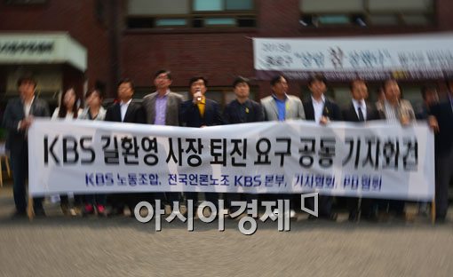 [아시아경제 백소아 기자] 23일 서울 종로구 청운효자동 주민센터에서 열린 KBS 길환영 사장 퇴진 요구 공동기자회견에서 참석자들이 발언을 하고 있다. KBS는 이날 오후 7시에 종료되는 투표 결과에 따라 총파업 여부를 결정할 예정이다.