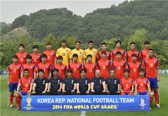 [연합뉴스]튀니지와의 평가전을 앞두고 26일 경기도 파주NFC에서 2014 브라질 월드컵 대표팀의 홍명보 감독과 코치진, 선수들이 단체사진을 찍고 있다.