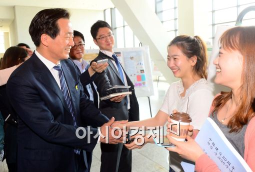 [아시아경제 최우창 기자]정몽준 새누리당 서울시장 후보가 27일 서울 서대문구 이화여자대학교 국제교육관을 찾은 가운데 여학생들과 인사를 나누고 있다.