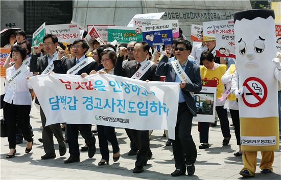 [연합뉴스]31일 서울 광화문광장 일대에서 세계 금연의 날 행사를 마친 참가자들이 담뱃갑 경고사진 도입과 담뱃값 인상 등을 촉구하는 캠페인을 하고 있다.