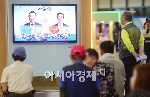 [아시아경제 백소아 기자] 6.4 지방선거일인 4일 서울 중구 서울역에서 시민들이 선거개표방송을 지켜보고 있다.