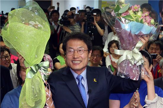 [연합뉴스] 조희연 서울시교육감 후보가 5일 오전 서울 종로구 새문안로 자신의 선거 캠프에서 당선이 확실시되자 꽃다발을 들고 환하게 웃고 있다.