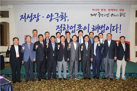 26일 제주도에서 진행 중인 '2014 중소기업 리더스포럼' 프로그램 중 하나로 진행된 정책토론회에 참석한 중소기업인들은 적합업종 제도의 법제화와 함께 확대 시행을 요구하고 나섰다.