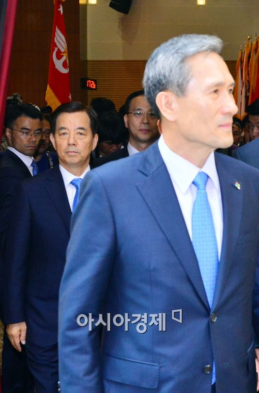 [아시아경제 최우창 기자]30일 서울 용산구 국방부에서 열린 제43·44대 국방부 장관 이·취임식에서 김관진(오른쪽) 전 장관과 한민구 신임장관이 행사장을 빠져.