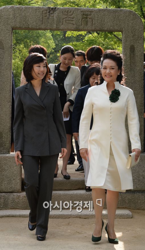[사진공동취재단]한국을 첫 국빈 방문한 시진핑(習近平) 중국 국가주석의 부인 펑리위안(彭麗媛) 여사가 3일 오후 조윤선 정무수석과 함께 창덕궁을 불로문을 지.